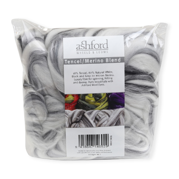 This is a luxurious fibre, perfect for spinning, weaving and felting. Dyes up really interestingly with with Ashford dyes as the Lyocell and black remain undyed and the white and grey give varying shades of the dye.